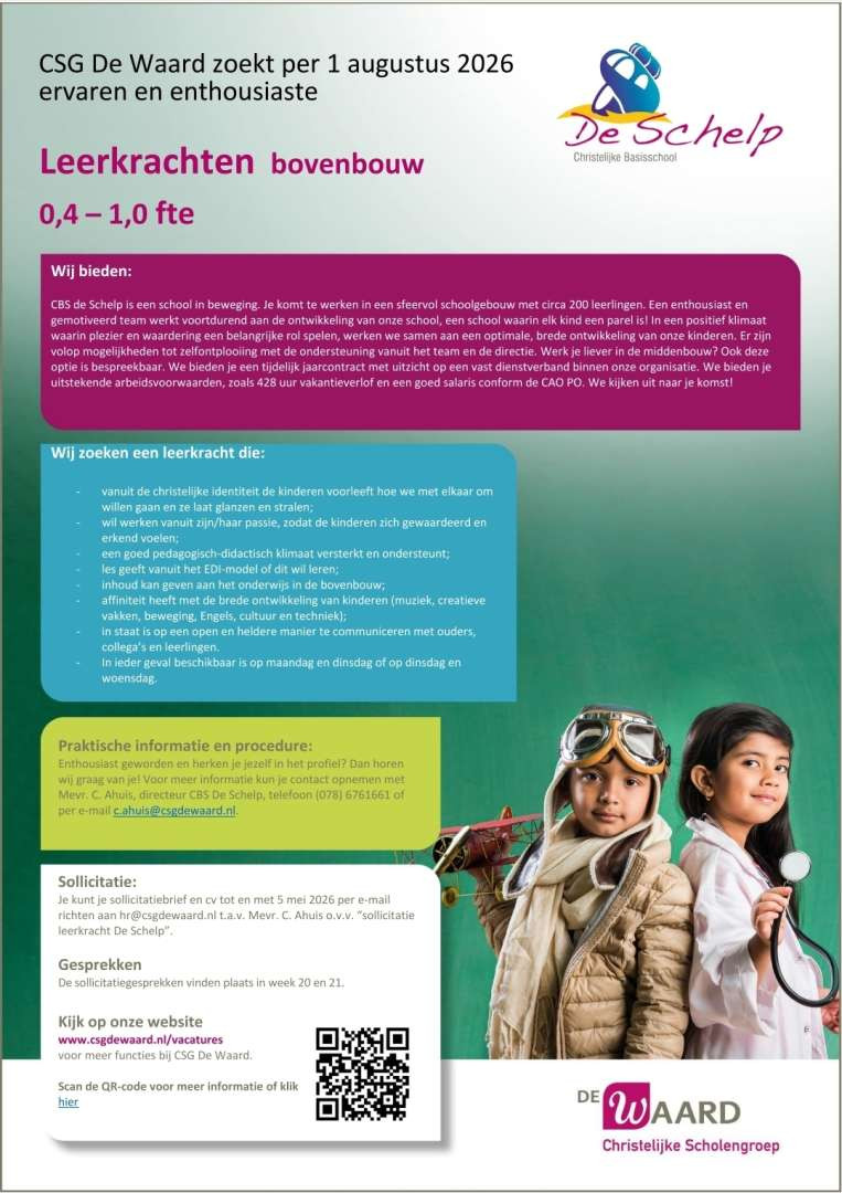 CBS De Schelp zoekt enthousiaste leerkrachten voor de bovenbouw (0,4 - 1,0 fte) per a augustus 2026.